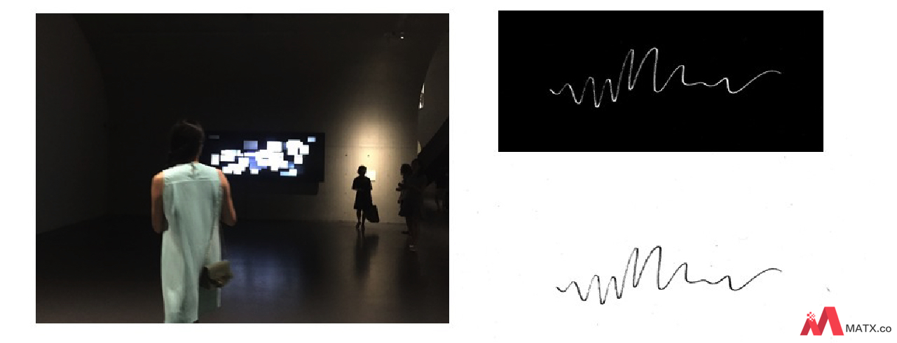 根据一条手绘的线条,使用特征提取算法,提取出线条的特征属性。将这些特征映射于人眼和脑电波有显著反映的闪烁频率,并以这些频率为基础制作视频。观众看到的是视频,但其实视频的频率会影响观众的脑电波。如果用脑电波采集设备可捕捉到这些信号,这些信号可通过计算机程序重新绘制出手绘的线条。
