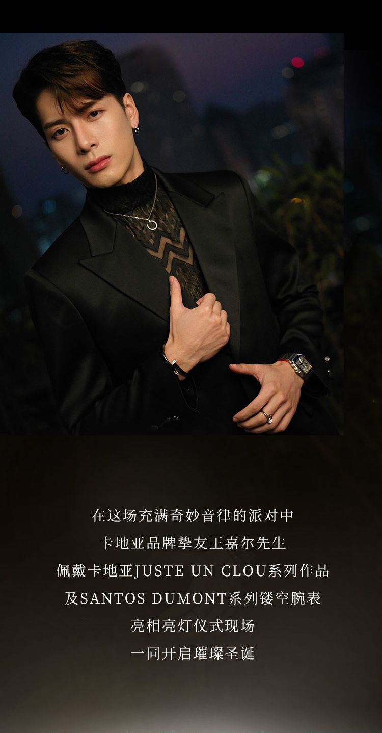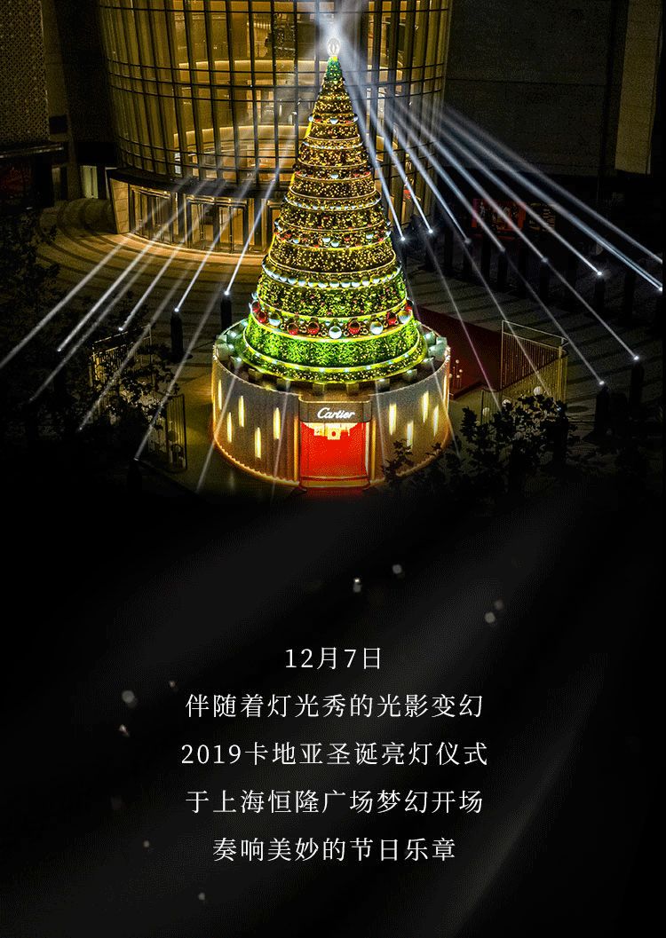 2019年12月7日,上海。卡地亚音乐圣诞树派对亮灯仪式,伴随着灯光秀和光影变幻2019卡地亚圣诞亮灯仪式于上海恒隆广场梦幻开场,奏响美妙节日乐章。灵动音符随着光影变幻跳动,璀璨光束自四周汇集,卡地亚圣诞树被映衬得熠熠生辉,充满欢乐之声的乐趣派对由此展开。在这场充满奇妙音律的派对中卡地亚品牌挚友王嘉尔先生佩戴卡地亚JUSTE UN CLOU系列作品及SANTOS DUMONT系列镂空腕表亮相亮灯仪式现场一同开启璀璨圣诞。
