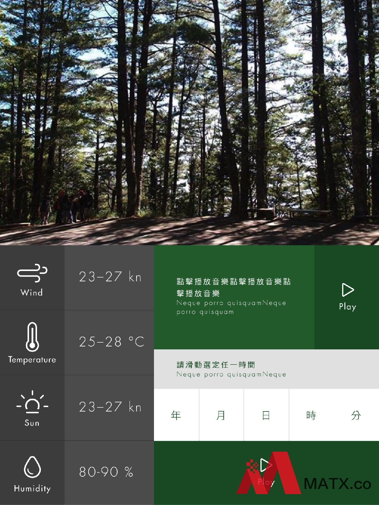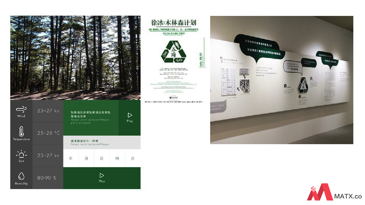 作品由三个部分构成,放置在森林中的简易气象站,展厅中的多部运行有定制程序的PAD,展厅中实时显示拍卖情况的大屏幕。展厅中的PAD通过网络获取森林中简易气象站的数据,得知树木生长的环境数据,并将这些数据转换为音乐。展厅中观众可以使用PAD,听取声音,查询树木生长的环境数据。